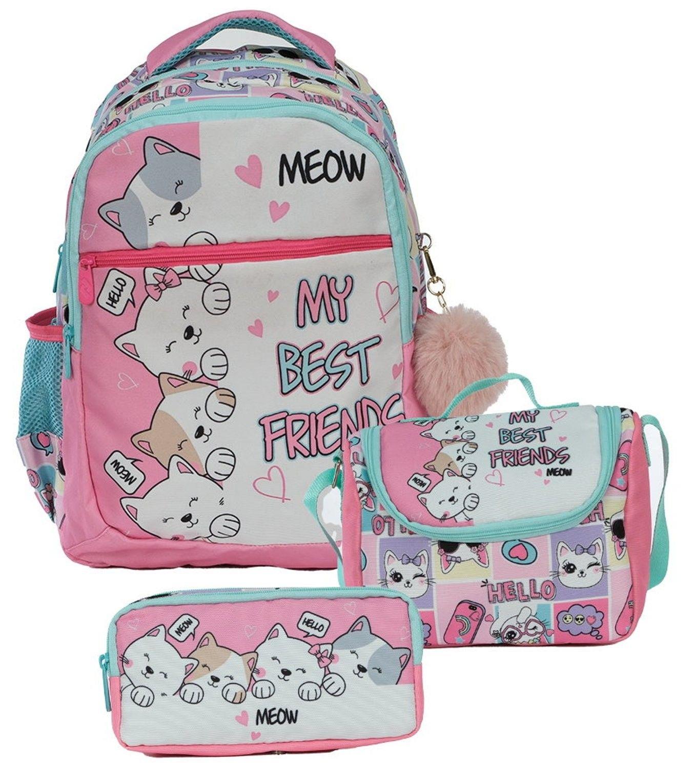 Pippa Kız Çocuk Üç Gözlü Pembe Beyaz İlkokul Üçlü Okul Çanta Seti - Sevimli Kediler - PPSET5200